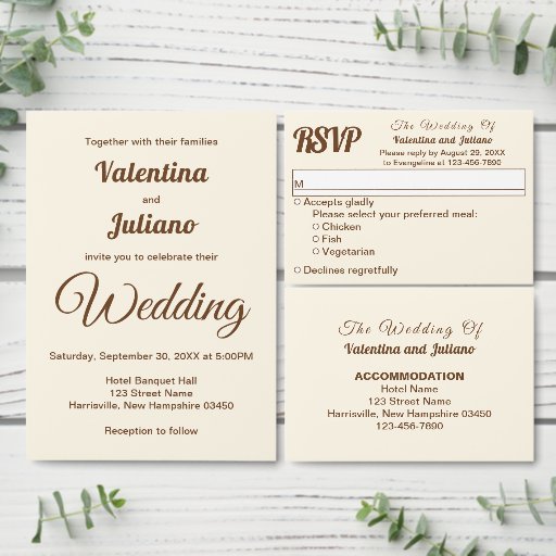 Ivory with Brown Typography Wedding Invitation Kaart (Personaliseer de collectie van deze zelfstandige maker.)Ivory with Brown Typography Wedding Invitation Kaart (Achterkant)Ivory with Brown Typography Wedding Invitation Kaart (Staand voorkant)