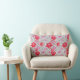 Lumbar kussen in een William Morris mapontwerp van bloemen in diep rood en fuchsia roze, met zilvergrijze / grijze bladwijnstokken tegen een witte achtergrond