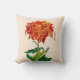 Drog kussen in een Japanse afbeelding van een chrysanten, in diep roestrood, oranje en goud, met bladeren in smarald en kalkgroen, tegen een gebroken witte/crèmeachtergrond, digitaal versterkt