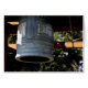Close-up uitzicht van een zware gietijzeren Japanse bel met een wit geschilderd schrift. De bel wordt geluid door de paal te pakken en heen en weer te duwen.