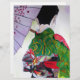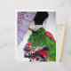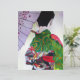 Uit een origineel schilderij van een kunstenaar Sacha Grossel van een Japans Geisha met een groene versierde, modieuze kimono en een zwarte en rode obi met een paarse paraplu met bloesems. Dit Japanse en Kyoto geïnspireerde ontwerp wordt beïnvloed door oosterse en Aziatische kunst en door het Japanse traditionele ontwerp van de mode.