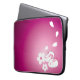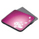 Een paarse laptophoes met een afbeelding van twee Japanse sneeuwkonijnen, twee sakura-bloemen en vier sakura-bloempitten op de rechterbenedenhoek, zodat er ruimte is voor tekst aan de linkerkant.