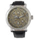 Jazz Trumpet Watch met industrieel steampunk-motief met metalen tandwielen, tandwielen, wielen in goud, zilver en koper. Uniek en cool horloge voor muzikanten, jazzclubbezoekers, trompettisten en muziekfans.