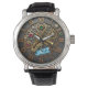 Unieke Jazz Music Watch met saxofoon, trompet en blauw neonlicht met "jazz" set binnen industriële / steampunk motief met tandwielen en tandwielen in goud met diamanten, robijnstenen. Fantastisch horloge voor muzikanten, jazzclubbezoekers, spelers en muziekfans.