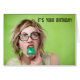 Een nerd uitziende vrouw met een wasmiddel in haar mond gezegde Het is je Verjaardag! Op de binnenkant staat: "Veel plezier! Maar doe niets doms!"