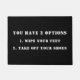 Je hebt 2 opties: 1. Je voeten afvegen, 2. Doe je schoenen uit. Krijg hun aandacht met een grappige boodschap of personaliseer met je eigen boodschap. Zwarte achtergrond met witte tekst.