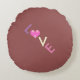 Een vierkant kussen met het woord *love* gespeld met kleurrijke letters. Bourgogne voorzijde met een bleek gele achterzijde