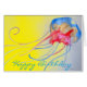 Original art hand drawn illustration of a jellyfish painted in watercolour by artist Sacha Grossel. This whimsical sea creature is on a beach themed background of yellow sand blue ocean. Een jellyfish birthday card.