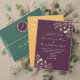 Elegant, modern, juweeltonen plum paars, geel en smaragdgroen bruiloft, bespaart de date uitnodiging met goudgele florale kant en eenvoudige kalligrafie.