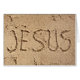 De naam Jezus schreef in strandzand.