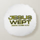 Dit ronde kussen toont een ontwerp met de woorden "Jesus Wept" met koning James John 11:35 bijbelgeschrift in een vetgedrukte print met gele & zwarte letters met gele en zwarte omtrek plus bijbelcitaat eronder in dit op geloof gebaseerde bijbelthema. Dit kussen is gemaakt van hoge kwaliteit stof onze kussens zijn zacht en rimpelvrij de hoes is wasbaar in de machine.