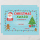 Fun and colorful Christmas Award Certificate template featuring a bright blue background, festive string lights border, Santa Claus, a Christmas tree, and gingerbread men. Perfect for rewarding children, family members, or classmates for good holiday behavior or funny achievements. Customizable and clear.