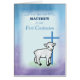 Het schaap staat voor een blauw kruis op deze katholieke felicitatiekaart als je een eerste bekentenis van een jongen viert. Met een kaart kun je zijn naam toevoegen voor een ware aandenken aan zijn Eerste Verzoening.