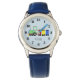 Dit schattige blauw kinder horloge heeft kleurrijke handgetekende doodle locomotief cartoon op blauw, en kan worden gepersonaliseerd met de naam van uw jongen. Perfect voor trein- en reisliefhebbende kinder!