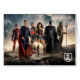 Bekijk de Justice League op een met mist gevuld, rotsachtig terrein. De zon gaat achter onze ketens schuil: de Flash, Superman, Cyborg, Wonder Woman, Batman en Aquaman.