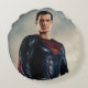 Bekijk de Superman van de Justice League die op een met mist gevuld, rotsachtig terrein staat. De zon stijgt boven de horizon in de blauwe hemel, waardoor de mist en wolken helder gaan gloeien.