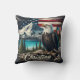 Een majestueuze zeearend staat trots op een boomtak, met uitzicht op bergen en een sereen meer, met een Amerikaanse vlag achtergrond.
