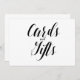 Eenvoudig en elegant zwart-wit kalligrafiestijk "Kaarten en Gifts" trouwbord. Dit trouwbord met Kaarten en cadeautjes ziet er geweldig uit op een mattepapier. Als je iets meer traditioneel nodig hebt, gebruik dan de Laid, Linen of Columned, voor een rustig gevoel gebruik van de Artisan Kraft, als je een tikje glam wilt toevoegen, gebruik dan de Luxe. Het klikken op de "pas het"knoop aan u tot het redacteurshulpmiddel kunt toegang hebben en een verschillende achtergrondkleur kiezen. Dit is een vlak gedrukt 5-inch x 7-inch kaartbord, dat er echt elegant uitziet in een afbeelding lijst.