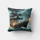 Een piratenschip vaart door turbulente wateren, schiet kanonnen af te vuren te midden van donkere wolken en bliksem, en toont een spannende zeeslag.