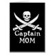 Aasuitgestrekte, oe lubbers! Verstuur me kappers! Kapitein Mam, show jager... die de baas is met de klassieke piratenvlag: een schedel en gekruiste messing. Savvy?