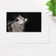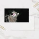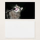 Grijze tabby kat zingt in een microfoon, amuserend en comisch karaoke visitekaartje