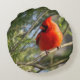 De noordelijke Kardinaal stakt een pose op decoratieve ronde kussen. Heerlijk accent voor thuisdecor!