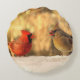 Hier is een ronde kussen met de heer en mevrouw Northern Cardinaal. Het is een herfst met glorieuze bladeren op de achtergrond, maar de eerste sneeuw is gevallen om ons een voorproefje van de winter te geven. Hij is een briljante rode kleur. Ze is oranje, goud en bruin. Beide hebben korsten en oranje snavels. Ze zijn echt de royalty van hobbyvogels met hun kenmerkende lied en mooie kleuren.