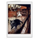 Een kat loopt op de spoorstaaf van een middeleeuws gebouw. Kunstwerk van Arthur Rackham.