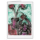 Een enge kat speelt met bloemen in een bloempot. Verbrand Sienna en blauw monopriint.