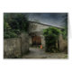 Tabbykat wacht op een oude deur in de binnenplaats.