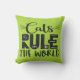 Trendy en heerlijk modern groen kussen met de woorden "Katten regeren de wereld", versierd met witte whiskers, krassen van katten, een kleine muis en een kleine poot.