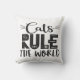 Trendy en heerlijk modern wit kussen met de woorden "Katten regeren de wereld", versierd met witte whiskers, krassen van katten, een kleine muis en een kleine poot.