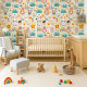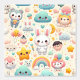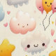 Maak de droomachtigste kawaii babykamer muur met dit grillige pastel behang. Een naadloos herhalend patroon van een witte kawaii konijn, lachende turquoise wolken, gloeiende sterren, zwevende harten, mini ballonnen, kawaii karakters en pastel glitters vult een warme crèmekleurige achtergrond in droomachtig turquoise, roze en geel — zacht, vrolijk en genderneutraal. Perfect voor babykamer accentwanden, kinderkamers, speelkamer en leeshoekjes. De meest magische kamer in huis begint hier.