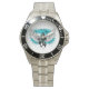 A beautiful watch with a very nice design. Two large white wings with angels, airplane, and a flight attendant upon the earth with a background blue sky.