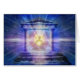 Staven in voorront die leiden tot tempel met zittende meditator met stralende kleuren die uitstralen en sterren op de ruimteachtergrond. Door Daniel B. Holeman. Gewijd aan het heilige hart van ALLEN.