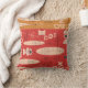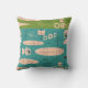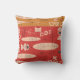 Moderne atoomgeïnspireerde kussen uit de middeleeuwen in vier kleuren, rood en oranje aan de voorkant en blauwgroen en avocado groen aan de achterkant. Abstracte vormen, lijnen en ovalen vertegenwoordigen de tijdsperiode.