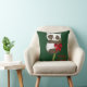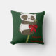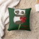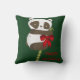Knuffel kussensloop met panda op bamboe met grote rode feestelijke strik en "Prettige Feestdagen" tekst. Bosgroene achtergrond, afbeelding op beide zijden van het kussen