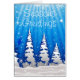 Een illustratie van sneeuw bedekte kerstbomen met een blauwe achtergrond met sterren en lichtbundels. wintersneeuwscène.