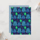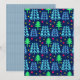 Groene, blauwe en turquoise decoratieve kerstbomen met gele en rode sneeuw op een donkerblauwe achtergrond.