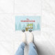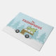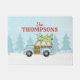 Robuuste blauwe auto of een houtachtige wagen met een versnipperde kerstboom aan de bovenkant van de auto in de sneeuwvloksneeuw. Een schattige winterscène gepersonaliseerd met een artistieke flair.