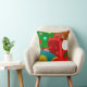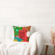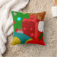 Dit kussen heeft een kerstontwerp van een collage van een kerstboom, een ornament, een kous, een geschenk en een peperkoekjongen.