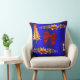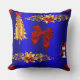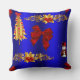 Een feestelijke kerstkussen met een kleurrijk patroon van gouden kerstbomen, gouden heilig met rode bessen, schattige sneeuwpoppen in rode fluwelen en rode zijden bogen op een koninklijke blauwe achtergrond om een stijlvolle en kleurrijke aanraking toe te voegen aan je kersthuis met het versieren van deze feestdagen.