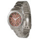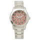 Dit dameshorloge heeft een geometrisch ontwerp van herhalende rode en dieprode driehoeken met groene cirkels bovenop een veld van gebroken wit. Wil je hetzelfde ontwerp in verschillende kleuren? Stuur me een bericht.