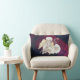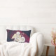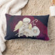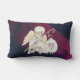 Een christelijk thema kussen. Ontworpen met een lieve engel met gele vleugels die een herdersstaf vasthoudt. Zittend met witte pluizige lammeren. Marineblauwe en bordeauxrode waterverf achtergrond, met kleine vlekjes nepgoud glinsterende glitter (geen echte glitter, maar een gedrukt beeld).
