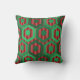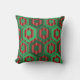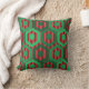 Deze werpkussens hebben een geometrisch ontwerp van zeshoeken in vier tinten groen op een gebied van strepen in twee tinten rood.