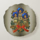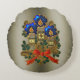Een feestelijke ronde kerstkussen met een afbeelding voor kerstmis met gloeiende kaarsen, heilig en rood lint.