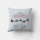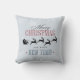 Een feestelijke kerstkussen. Een subtiele grijze achtergrond met sneeuwvlokken. Fancy trendy letters die zeggen: vrolijk kerstfeest en gelukkig nieuwjaar. Met een zwart silhouet van santa die in zijn slee rijdt en door zijn rendier over de hemel vliegt.