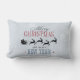 Een feestelijke kerstkussen. Een subtiele grijze achtergrond met sneeuwvlokken. Fancy trendy letters die zeggen: vrolijk kerstfeest en gelukkig nieuwjaar. Met een zwart silhouet van santa die in zijn slee rijdt en door zijn rendier over de hemel vliegt.
