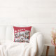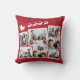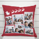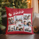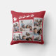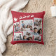 Feestelijke rode vakantie keepsake kussen met een 7 foto collage van verspreide afbeeldingen in witte lijsten en een witte afbeelding van rendieren vliegen Santa's slee.