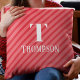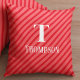 Dit ontwerp is voorzien van een leuk monogram voor kerstvakantie, grillige rode gestreepte strepen, met een sjabloon voor de familienaam monogram initiaal, een eenvoudige minimalistische feestelijke vrolijkheid, een stijlvol trendy typografie lettertype, een eenvoudige witte overlay belettering, een kerstvakantie home decor kussen, een kerstvakantie monogram decor, een rood en wit kerstkleur, een leuk feestelijk vakantiepatroon